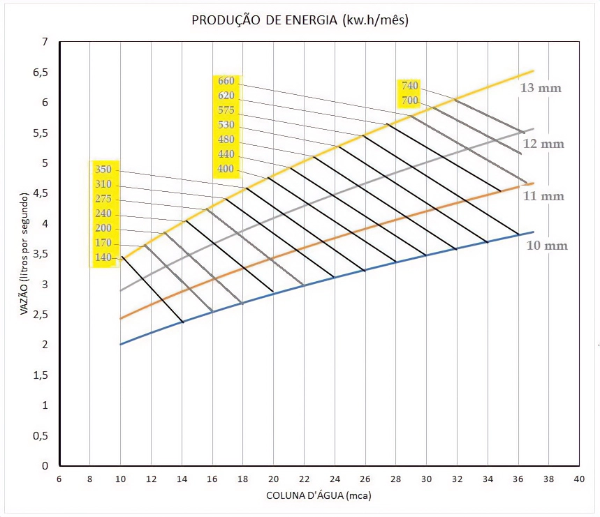 Usando o gráfico acima é possível determinar a geração de energia em uma instalação partindo da coluna de água no local. Identifique no eixo horizontal o desnível disponível (mca) e siga na vertical até encontrar a linha colorida correspondente ao orifício do bocal da turbina. Verifique no eixo vertical se a vazão é igual ou superior à indicada. Siga a linha inclinada até o quadro amarelo onde está indicada a quantidade de energia que a turbina ira gerar em um mâs de trabalho contínuo.