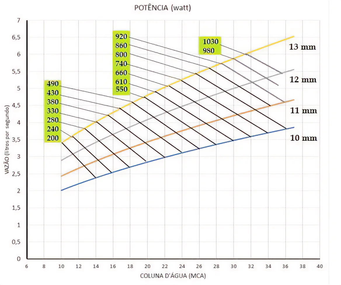 Usando o gráfico acima é possível determinar a potência disponível em uma instalação partindo da coluna de água no local. Identifique no eixo horizontal o desnível disponível (mca) e siga na vertical até encontrar a linha colorida correspondente ao orifício do bocal da turbina. Verifique no eixo vertical se a vazão é igual ou superior à indicada. Siga a linha inclinada até o quadro verde onde está indicada a potência disponível.